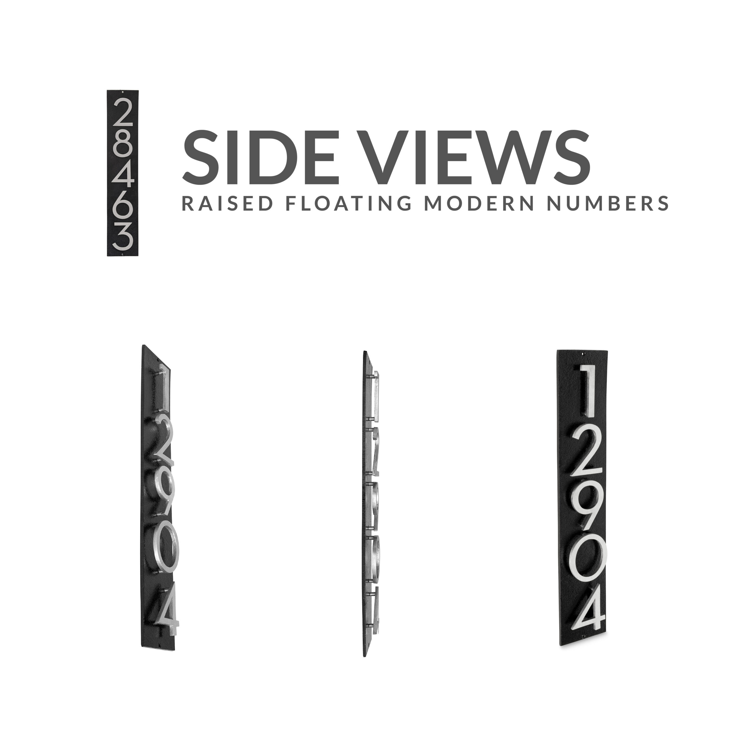 Raised floating solid cast aluminum numbers on a 1/4" thick solid aluminum backplate |
